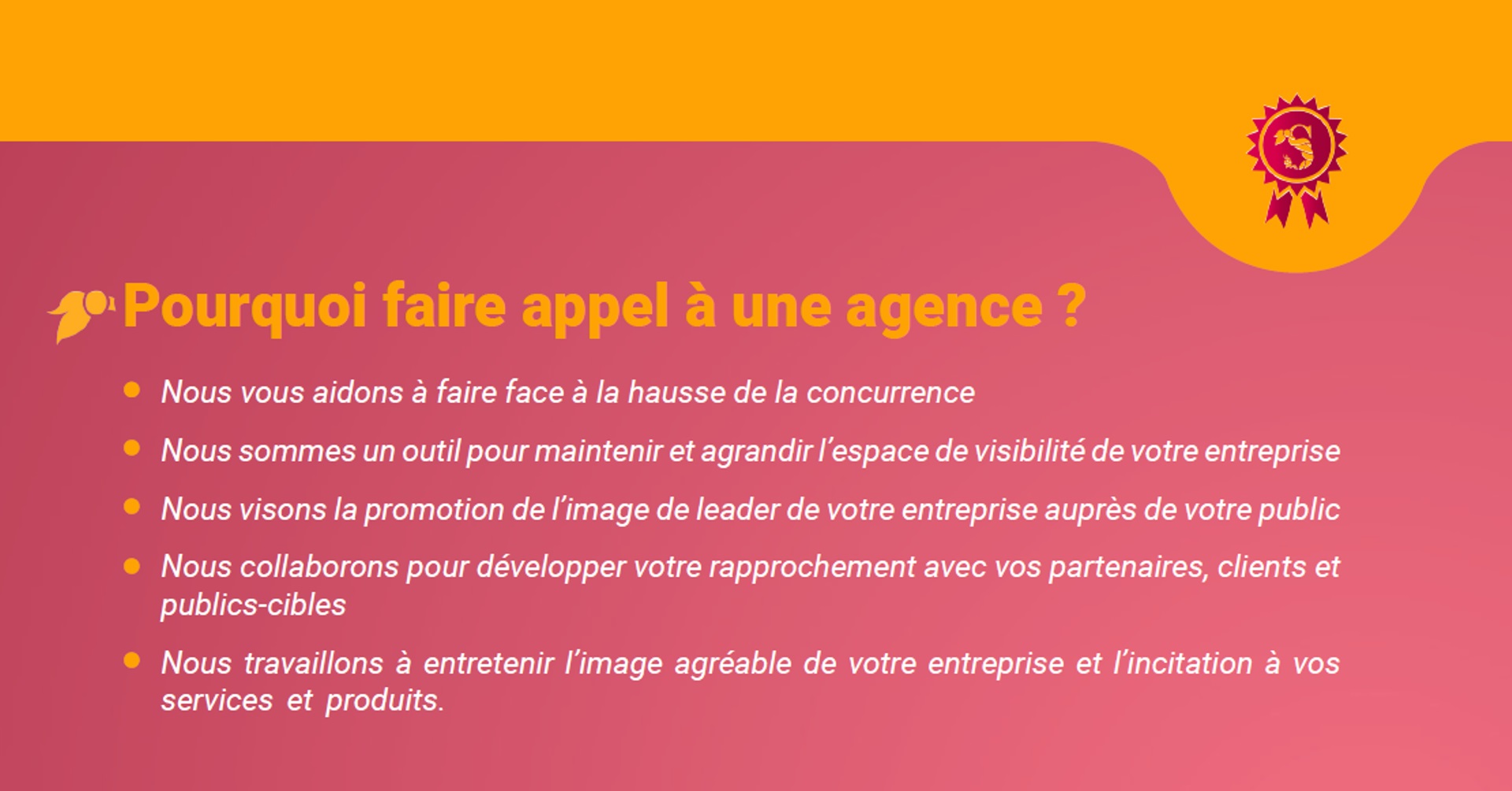 Nous vous aidons à faire face à la hausse de la concurrence.Nous sommes un outil pour maintenir et agrandir la visibilité de votre entreprise.Nous visons la promotion de l'image de leader de votre entreprise auprès de votre public.Nous collaborons pour développer votre rapprochement avec vos partenaires, clients et publics-cibles.Nous travaillons à entretenir l'image agréable de votre entreprise et l'incitation à vos services et produits.